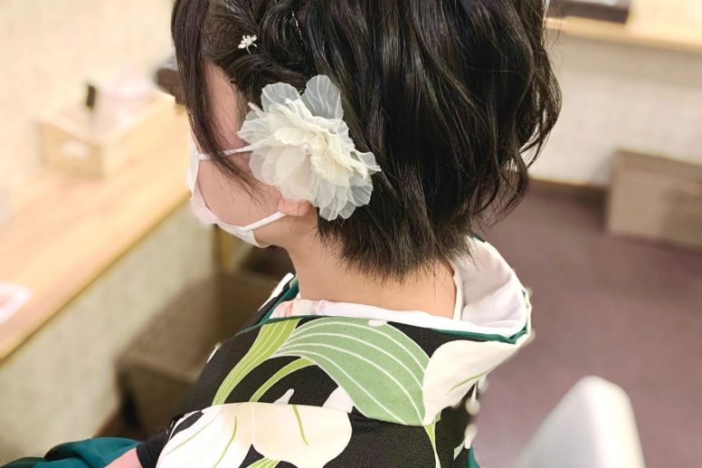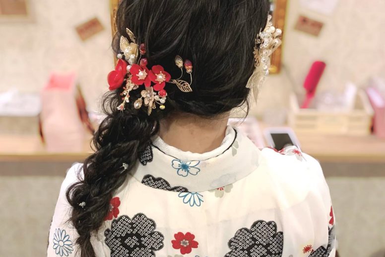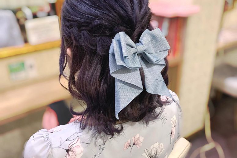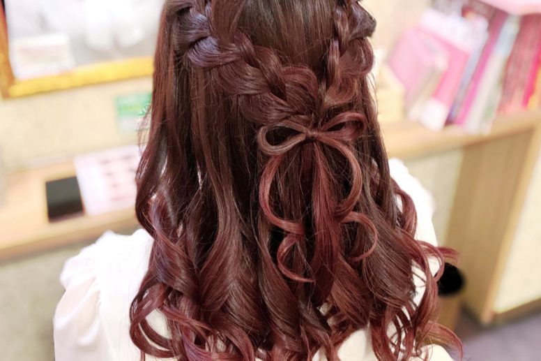 …編み込みハーフアップ+髪リボン顔周りを多めに残 …